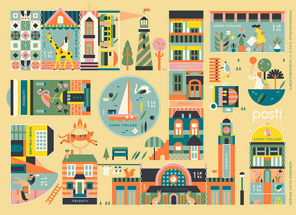 Tämän vuoden syyspostimerkit sijoittuvat värikkääseen kaupunkimaisemaan. Graafikko ja kuvittaja Lotta Nieminen on suunnitellut kuuden postimerkin pienoisarkkiin hyväntuulisen mielikuvituskaupungin, jossa eläimet ja ihmiset asuvat iloisesti rinnakkain. “Suunnittelin kuhunkin postimerkkiin pienen talon, joista jokainen voi rakentaa postilähetykseen omannäköisensä pienoiskaupungin”, kuvailee Nieminen itse Eläinten kaupunki -pienoisarkkia.